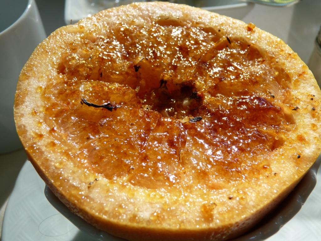 Then comes a choice of raisin scone or lemon muffin, and it makes me a lazy photographer, but that picture I missed. And to finish, here comes a grapefruit with caramelized top: