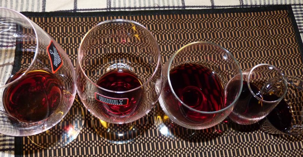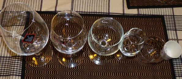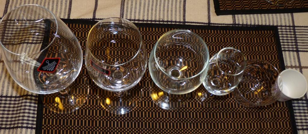 The glasses included: Riedel Cabernet Sauvignon Glass, Riedel Universal tasting (also can be called “restaurant special”, 489 0 in Riedel nomenclature) glass (holds 20 oz), a wide open, almost “square” glass (don’t know if it has a special name), small (8 oz) universal tasting glass, plastic cup and small paper cup.