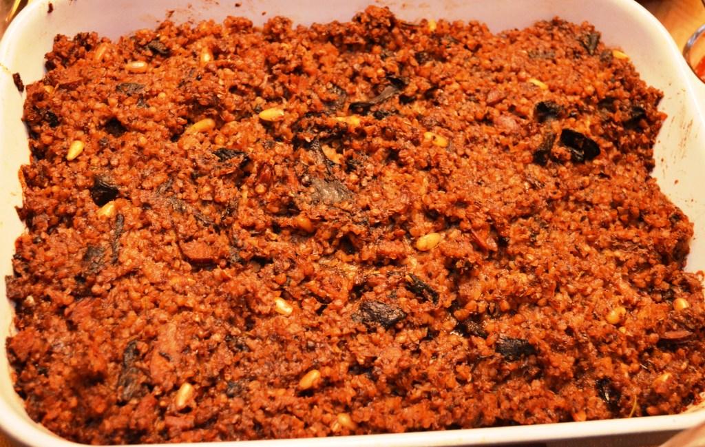 First, buckwheat with pine nuts, wild mushrooms and onions ( the same as went inside the turkey) and spicy Andalusian turkey sausage:
