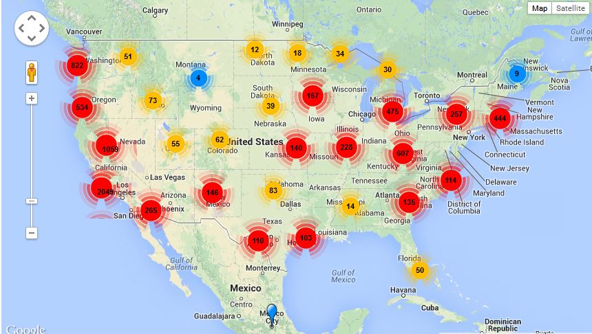 Let’s start with the simple fact – today (and for more than past 10 years), the wine is produced in all 50 United States. Yes, that includes Alaska, North Dakota and all other states you would never associate with winemaking. There are more than 8,000 wineries in the United States. I found interesting web site, called the Wine Web, which lists 8,229 wineries across the US (as of today, August 14 2014). Here is the winery map across US which was created using this web site: