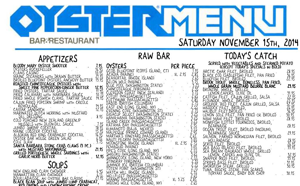 As you enter into the restaurant, you get the feel of the authentic diner from the 30th. Nope, I’m not that old, but this is an impression from the movies. Red checkered cloth definitely adds to the ambiance. And once you get to your table and given the menu, especially if you are a seafood aficionado, you understand that you are literally in the heaven. The menu is presented as unassuming large piece of paper. The reason for this is simple – the new menu is printed every day (!), as the bulk of the menu is a fresh catch. Nope, they don’t offer the coveted but equally anonymous “oysters on the half shell”, where you get whatever single kind of oyster there is. You can pick and chose from the daily selection of about 30 (!) different oysters. Overall, Oyster Bar has a 5 pages long oyster list which includes about 250 (!!) different oysters – here is the link for you to take a look. Of course the menu goes well beyond oysters offering all kinds of fish and seafood. Here is a fragment of the menu from November 15th: