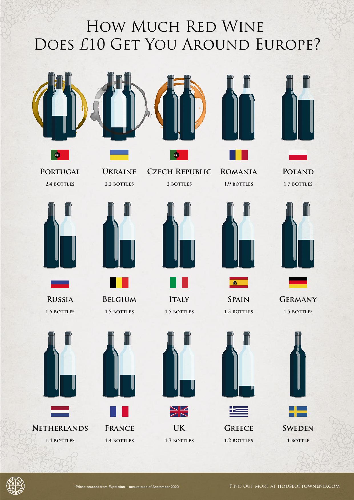 As you can see, the same £10 would allow you to drink in Portugal twice as much red wine as in Sweden.