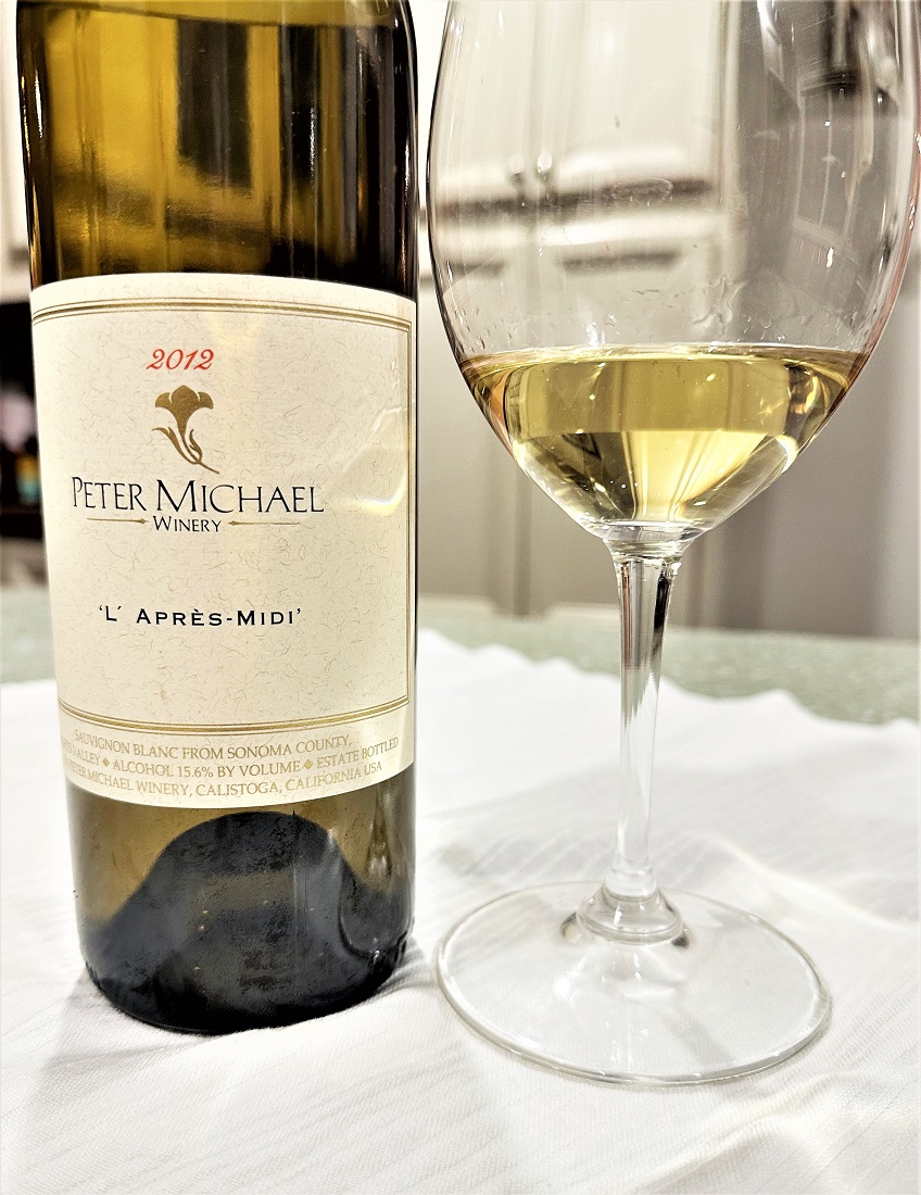 A few weeks ago, I spoke with my friend Zak (the wine store owner) who mentioned his recent experience with Peter Michael wine – he open a bottle of an older Peter Michael Sauvignon Blanc, and it was practically on the way out, actively developing tertiary aromas. A few days after this conversation, after a long day, I suddenly had an urge for a glass of white wine late in the evening. This doesn’t happen that often, but hey, obey your craving… After mindlessly pulling a few shelves in the wine cabinet, I came across the one with Peter Michael bottles. “Aha, this 2012 Peter Michael L’Après-Midi Estate Napa Valley (15.6% ABV, 95% Sauvignon Blanc, 5% Semillon, 8 months in French oak) is probably gone already anyway, why don’t I open that”.