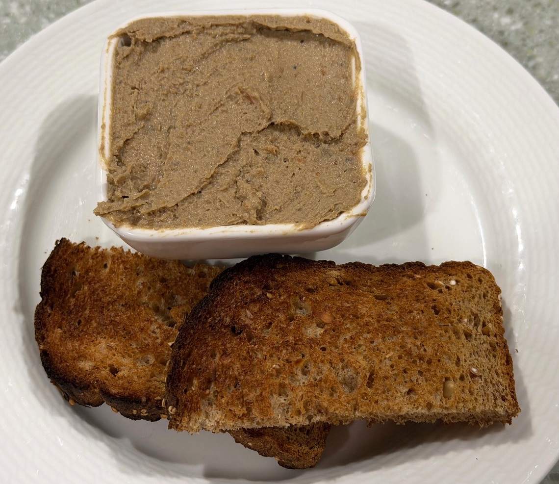 Okay, now to the chicken liver pate. I love chicken liver pate. When it is well-made and tasty, just spread it on the toast, maybe add some onion preserve or a cornichon, take a bite, and your taste buds start singing. To me, it is one of the simple pleasures.