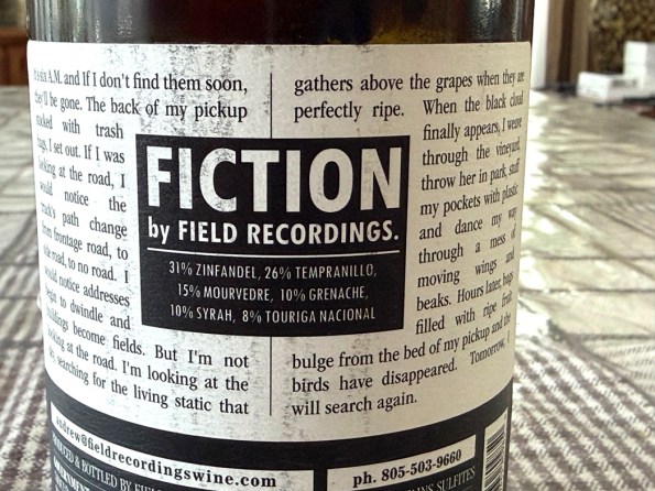 And then there was 2013 Fiction by Field Recordings Paso Robles (13.5% ABV, 31% Zinfandel, 26% Tempranillo, 15% Mourvèdre, 10% Grenache, 10% Syrah, 8% Touriga Nacional). This was my only bottle with an original label, which I really loved and much prefer to the current ones. There is nothing wrong with the current label, only that the original one, with a flock of birds, was conveying the message of bottled poetry a lot better – or rather music, as I wrote in my first post about this wine, Music, Recorded in the Vineyard.