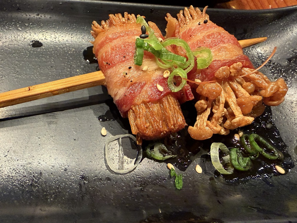 Bacon-wrapped oyster mushroom – wow. Tastes similar to scallop. This is really something. A properly chewy, slightly sweet mushroom wrapped in a delicious, salty piece of bacon. Wow.
