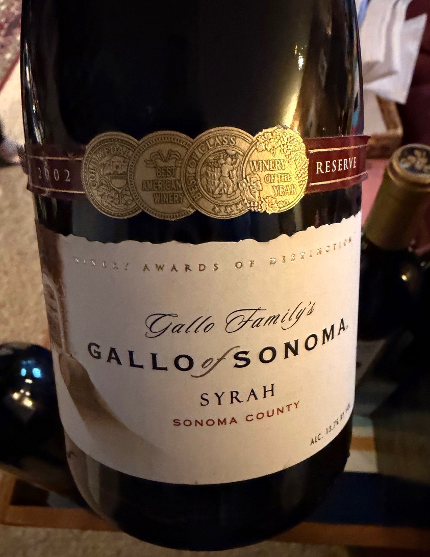 Now, let’s talk about surprises. Over the weekend, we visited friends whom we hadn’t seen in a while. Over the years, they have accumulated a variety of bottles – nothing of the “collector” level, no, just simple everyday wines which were acquired to be enjoyed at a party and simply left unopened. Now, when we come over, knowing that I’m a wine geek, they always love to pull out some random bottle to try. This time, the random bottle was a 2002 Gallo Family’s Gallo of Sonoma Syrah Reserve Sonoma County (13.75% ABV).