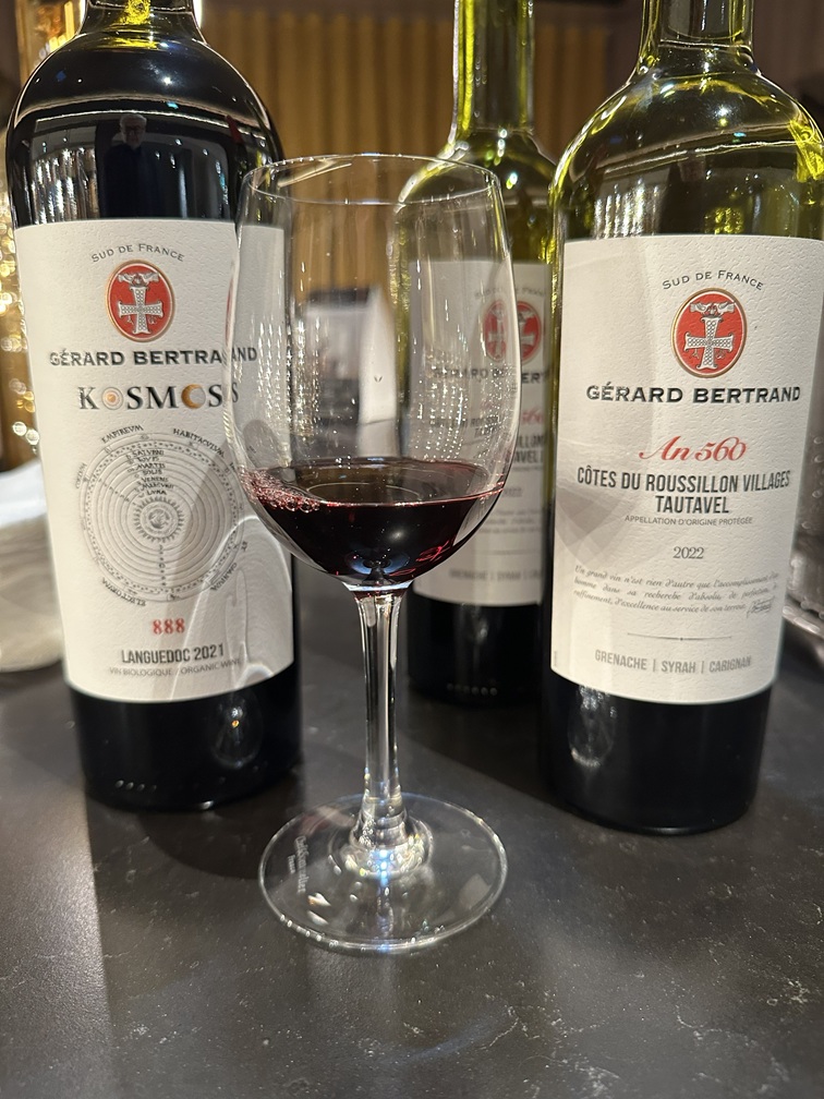 It is interesting how the second wine couldn’t be any more different. 2022 Gérard Bertrand Héritage An 560 Côtes du Roussillon Villages Tautavel AOP (15% ABV, a blend of Grenache, Syrah, and Carignan) was much leaner despite higher ABV, tight, restrained, with firm structure, firm body, and more pronounced tannins – also perfectly elegant, but requiring you to slow down a bit to savor the beauty. Here again, I feel compelled to cite the description on the back label: “Gérard Bertrand reveals the history of South of France greatest terroirs. At the origin of humanity, 560 000 years ago, our ancestors already lived on the lands of Tautavel. The magnificent and secular landscapes are home to a vineyard in a limestone and schist clay amphitheater”.