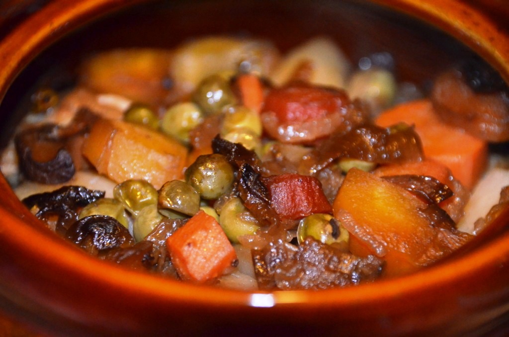 Check the casserole periodically and give the content a good stir every time. Make sure the liquid is slowly simmering and not rapidly boiling – reduce heat further if it is. Also, check the sauce for salt – adjust the amount to your liking. The cooking process should take about 3 hours from the moment you combined all the ingredients – check the meat periodically to see if it is done to your liking. Tougher cuts of meat might take a little longer.