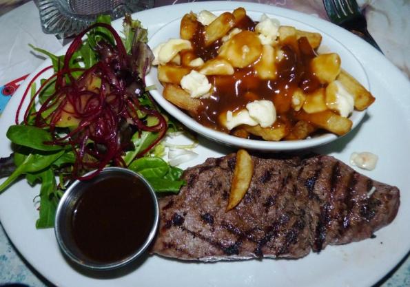 Steak with Poutine (Poutine is Quebec’s specialty – french fries with melted cheese and gravy – very very good):