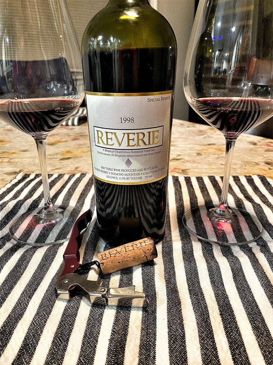I never had this wine before. While looking for the 1998 wines to buy (birth year of my son) at the Benchmark Wine, I came across this 1998 Reverie Special Reserve Meritage as it was described. At $30, 22 years old unknown wine from California sounds like a risk I was willing to take (so far, I didn’t miss – “knock on wood” – even a single time buying aged wines from Benchmark Wine, everything was tasty and perfectly drinkable). In the wine fridge, this wine was laying on one of the first shelves I pulled out, and the inner voice quickly said “this is it” – I decided not to argue.