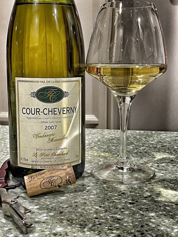 2007 François Cazin Le Petit Chambord Cour-Cheverny AOC (12% ABV, 100% Romorantin) – bright white stone fruit on the nose, citrus (lemon) notes on the palate, medium to full body, zinging acidity. It is getting there, but needs another 4-5 years to achieve full beauty and grace. 8-
