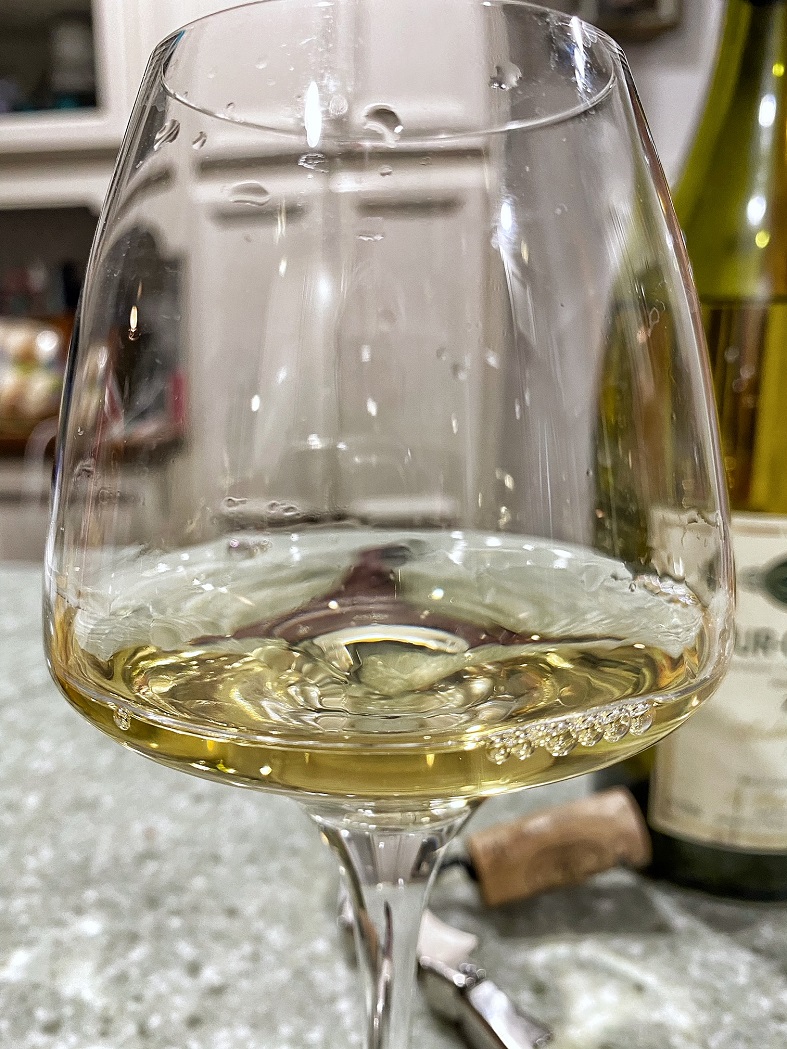 The bottle is out of the wine fridge. Cork goes out in one piece with no issues. I poured wine into the glass to take a picture. Beautiful color, between light golden and golden – remember, this is 15 years old white wine.