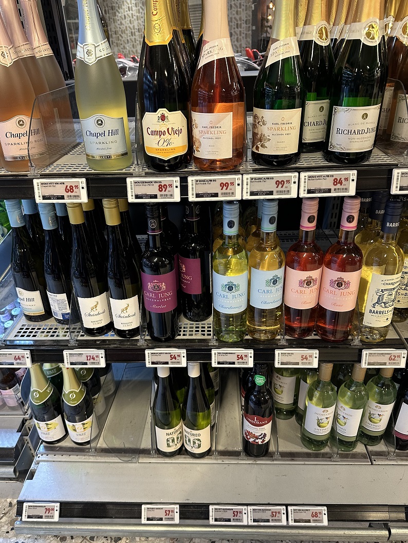 I visited the supermarket on Sunday, and Systembolaget stores are simply closed on Sunday (or at least the one I was near in Gothenburg). The supermarket actually offered wine – alcohol-free wine that is. I guess alcohol-free wine is a thing in Sweden, both locally produced (mostly from fruit, not grapes) and imported wines – and imported alcohol-free selection even included some familiar names, such as Campo Viejo, for example – you can see the sample selection in the pictures below: