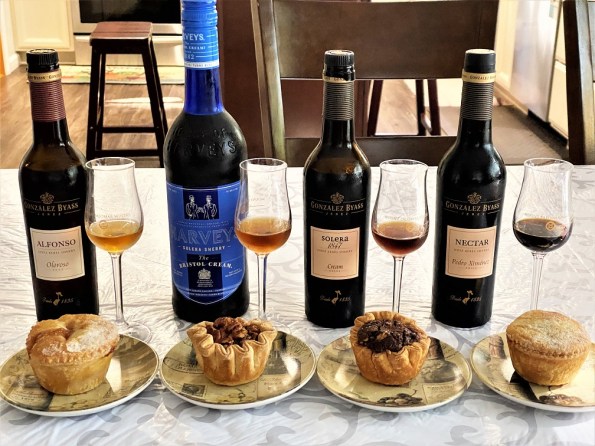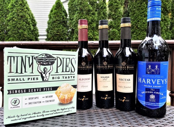 Oh yes, the dessert. This week, November 8 – 14, 2021, is designated as Sherry Week (#SherryWeek2021), a worldwide celebration of this unique wine. As part of the festivities, I received samples of the Sherry wines produced by González Byass, one of the purveyors of the fine Sherry wines. Moreover, the sherries were accompanied by dessert, and suggested pairings! I got a selection of pies from Tiny Pies to pair along with the Gonzalez Byass Sherries as follows: