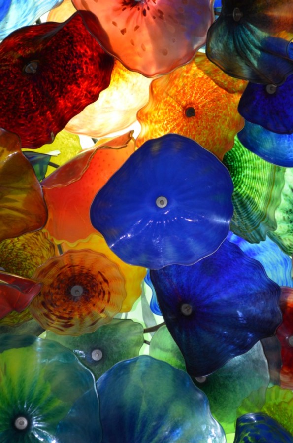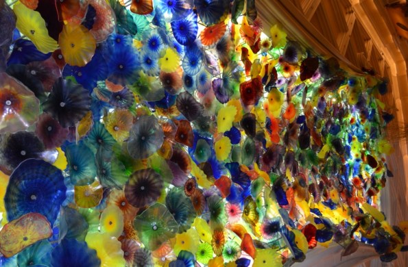 The break is over, and we need to get back to our program. Next on the list? Cirque de Soleil “O” show at Bellagio. First, of course, is getting there. This time we decided on the taxi. Excellent choice, took us only 25 minutes to drive about 2 miles. Note to self – “it is Friday night, stupid”. Once at Bellagio, you start getting acquainted with the place by admiring amazing glass chandelier which is literally the first thing you see after walking in. It is created by the world famous glass artist Dale Chihuli, and you can spend quite a bit of time adoring the magnificent exuberance. My pictures will not do justice to it, but remember, I told you before – I took pictures and I want to share them, so here you go: