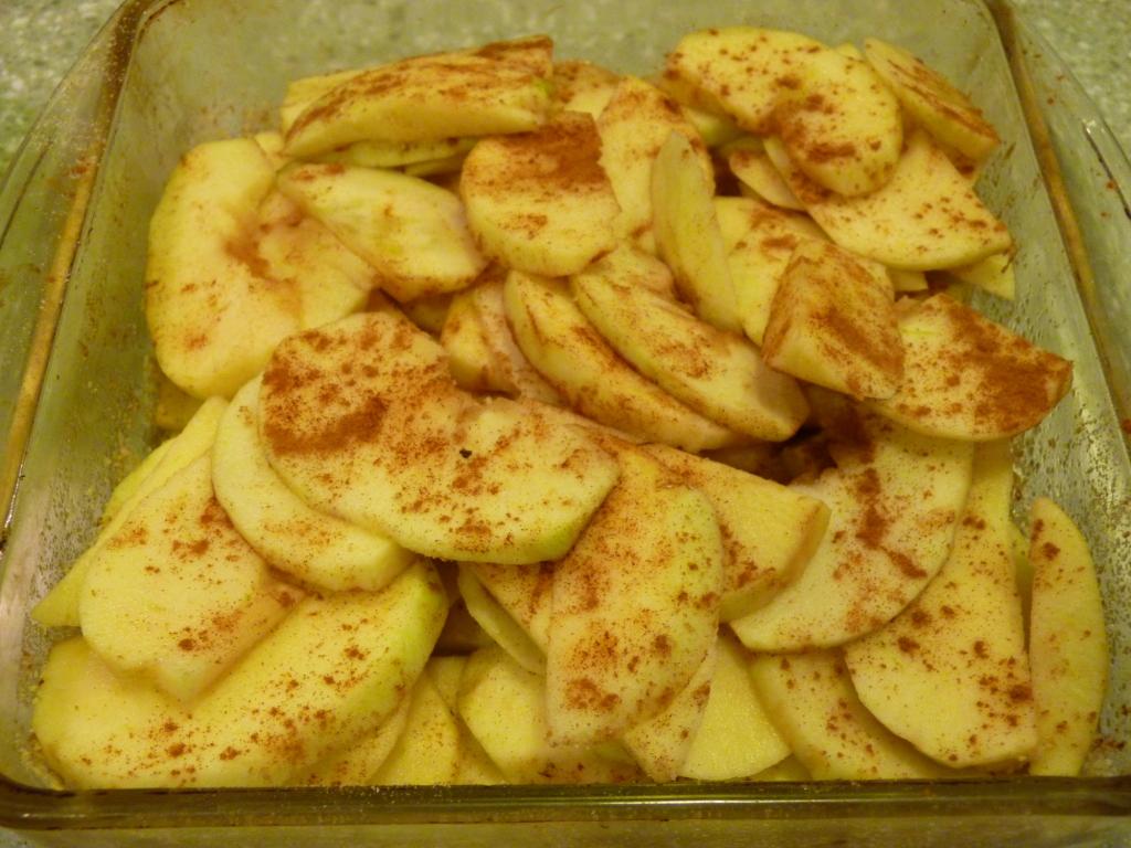 Then, put sliced apples into the pan and sprinkle them with cinnamon (the amount of cinnamon goes by the taste):