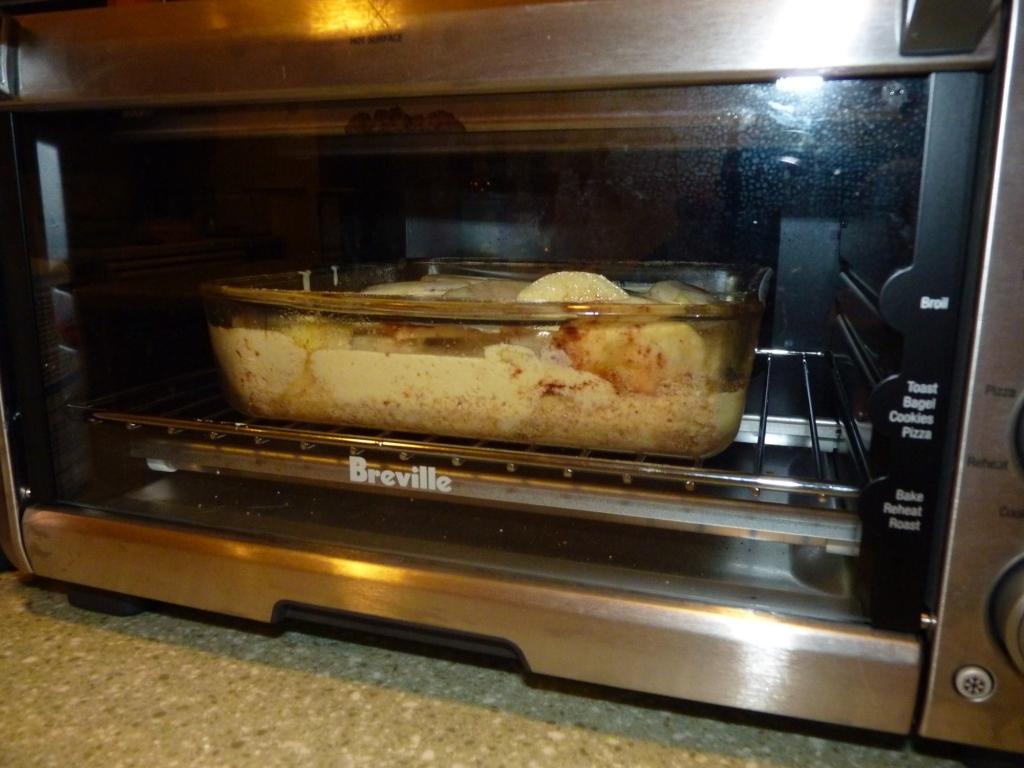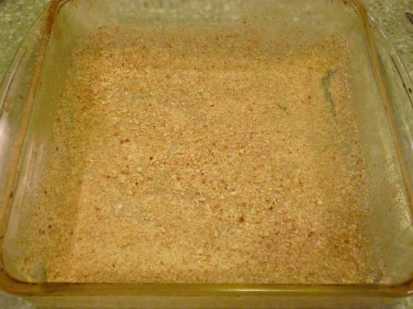 Grease pan with butter and cover with bread crumbs. Bread crumbs should cover the bottom and walls of the pan. Remove excess bread crumbs. Your pan should look like this: