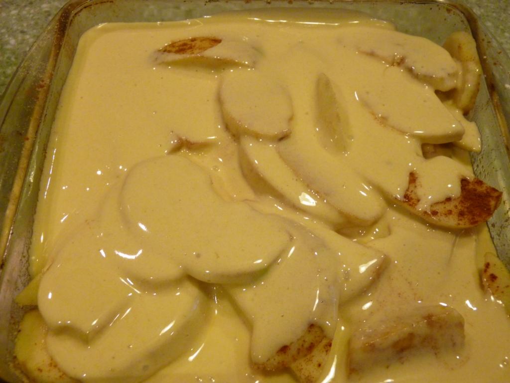 Core and peel the apples, and slice them thin. Make the dough: blend eggs first, then add sugar, and then flour. Make sure you end up with liquid and consistent dough. Meanwhile, preheat the oven to 425F.