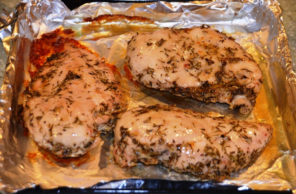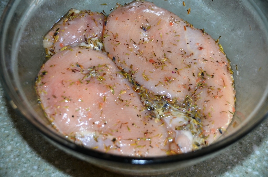 Cooking instructions: Take chicken breast, put it the bowl, add herbs, spices, salt, pepper and olive oil. Mix together, cover with plastic, refrigerate for few hours if desired. Pre-heat oven at 375F. Arrange chicken breast on the roasting pan, put in the oven and cook uncovered for about 15 minutes per pound. When done – take out, let it cool down. Voila – your roasted chicken breast is ready to be used for many possible applications. Here is the same recipe in the form of pictures: