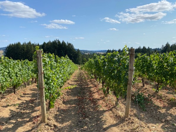 Utopia Vineyard looks different from Le Cadeau and Lenné – no fighting with the rocks here. Gentle slope elevation of only 20 feet from top to bottom makes it easier to tend for grapes. Utopia Vineyard is farmed using Sustainable Organic practices and was L.I.V.E. certified in 2008. Dan practices dry farming and uses cover crops every second row – in normal conditions though. Summer 2021 was so dry and hot that by the second week in August when we visited, all of the cover crops were removed so it will not compete with vines for access to water. The grapes looked perfectly healthy and beautiful despite the hot weather – you can see it for yourself in the pictures below.
