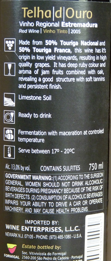 I’m glad to say that the last wine I tried in the project was one of those excellent wines. 2005 Telha d’Ouro Vinho Regional Estremadura ($6.99), blend of two Portuguese noble grapes – 50% Touriga Nacional and 50% Touriga Franca. The wine exhibited blackberries and soft plum on the nose. More ripe plums on the palate together with tobacco and hint of pepper. Tannins were hiding at the beginning ( wine had to breathe for about 30 minutes), then opened very powerfully (may be even over-powering). Presence of good